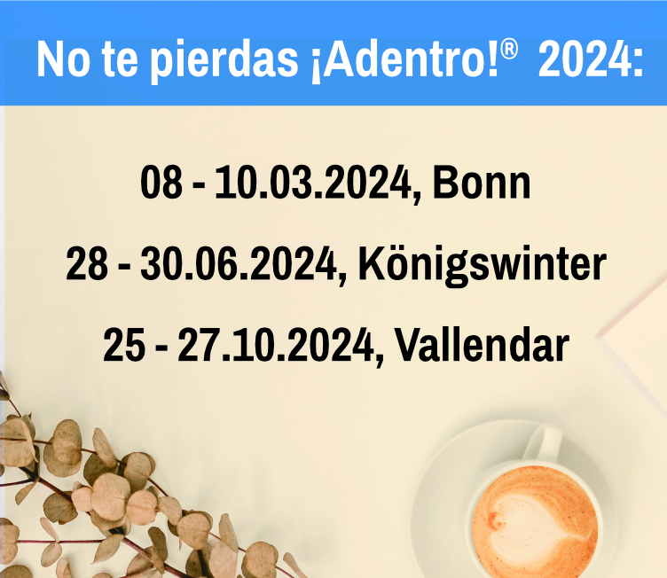 | Fechas de ¡Adentro!® en 2024: 08 – 10.03.2024, Bonn 28 – 30.06.2024, Königswinter 25 – 27.10.2024, Vallendar |