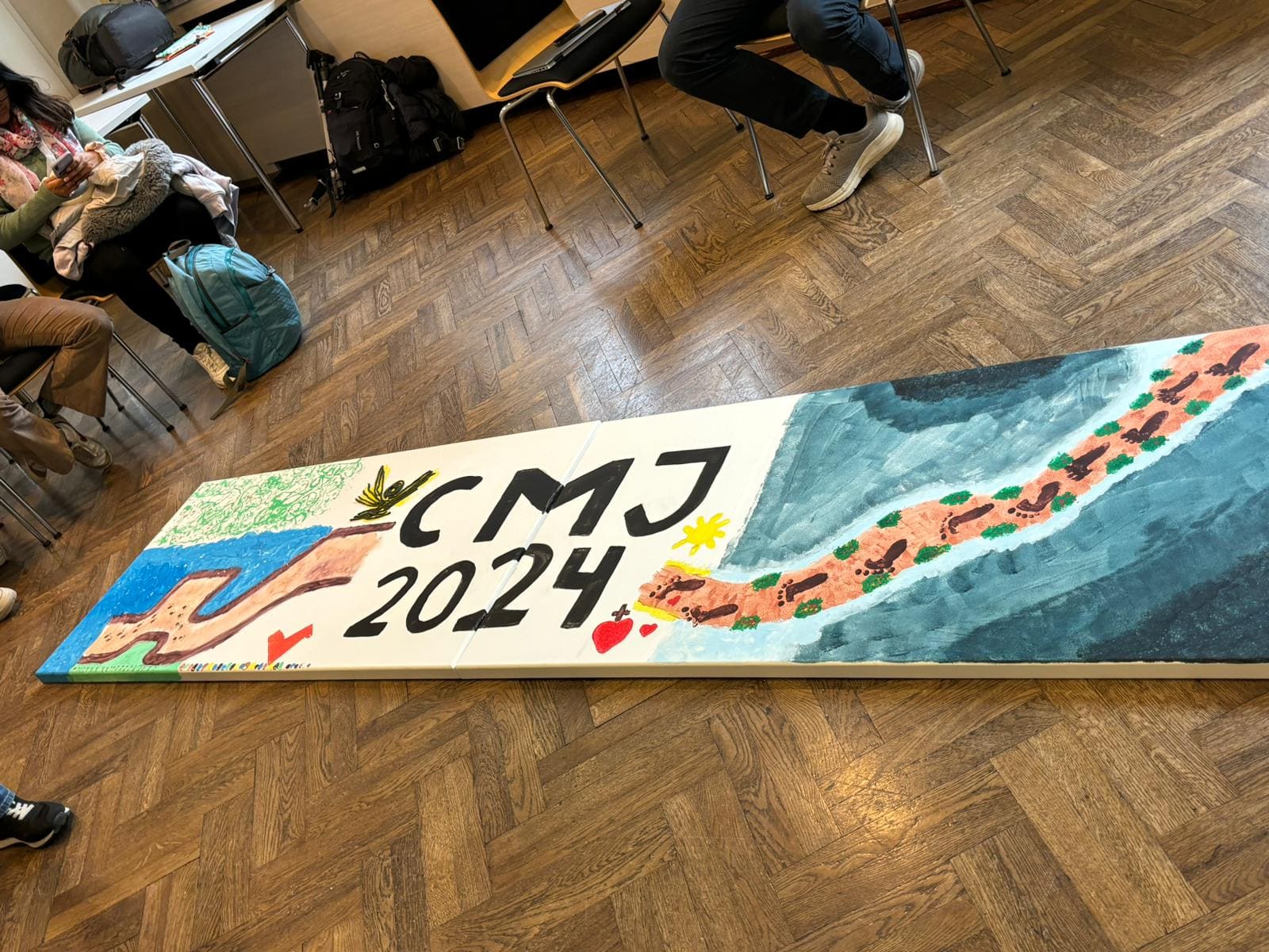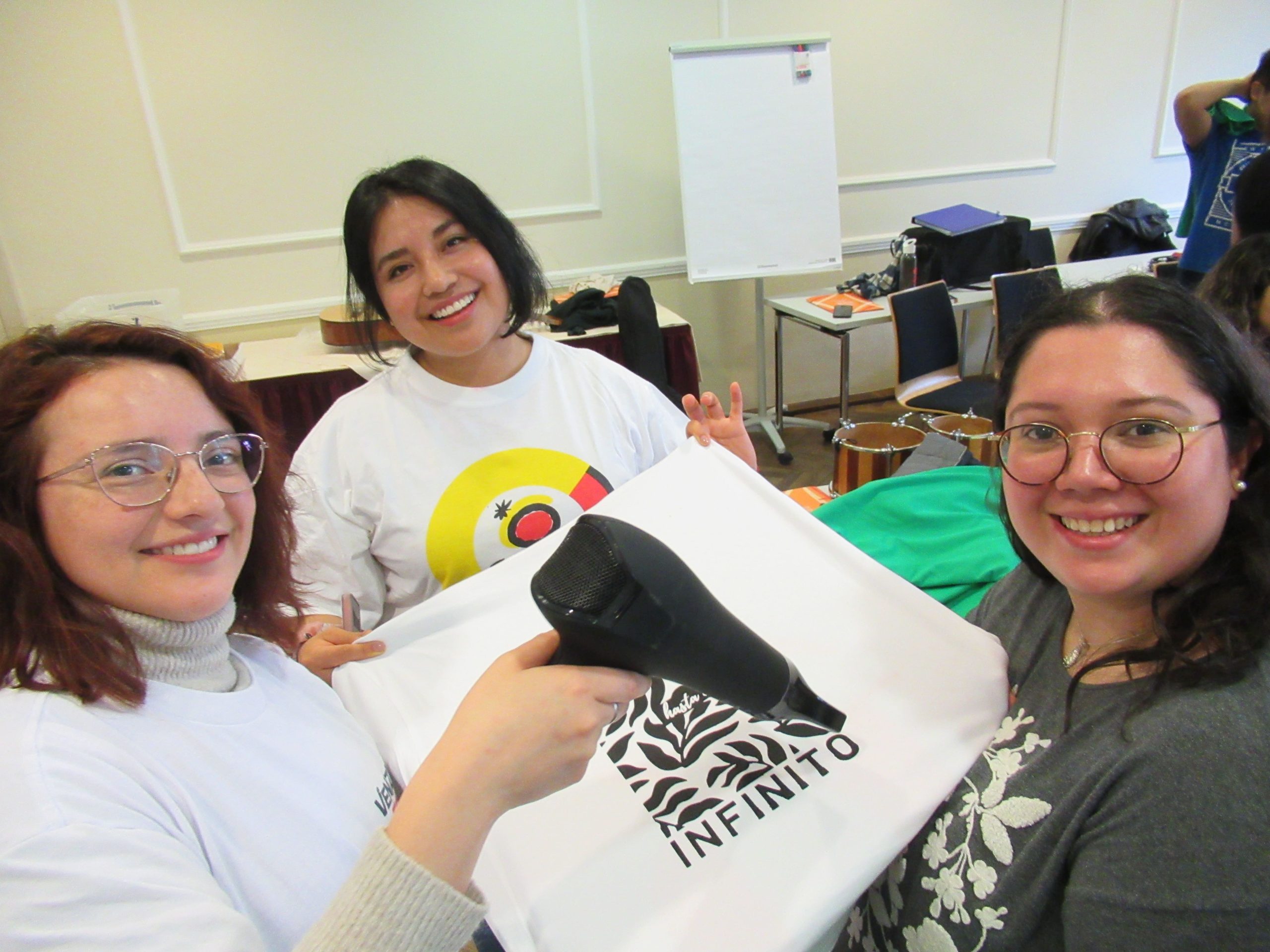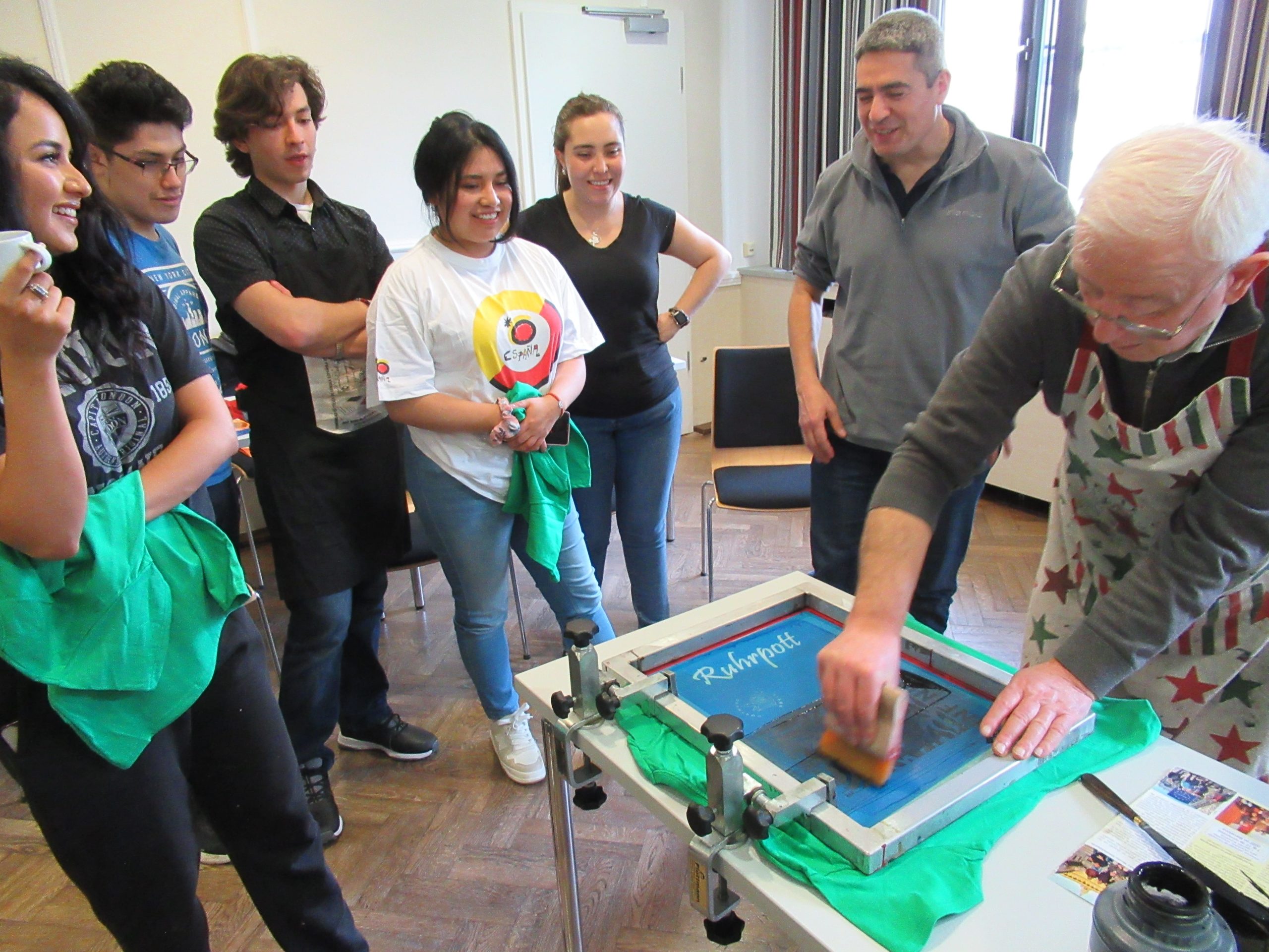 El segundo día inició con una Eucaristía, seguido de un taller de serigrafía, dirigido por el Padre Juan María Latorre, donde imprimimos logos en camisetas. A continuación se ofreció un taller donde se dio la oportunidad a los participantes de desarrollar su creatividad en grupo. El objetivo era crear un cuadro usando diferentes objetos y partes del cuerpo para pintar; el resultado fue un hermoso lienzo.