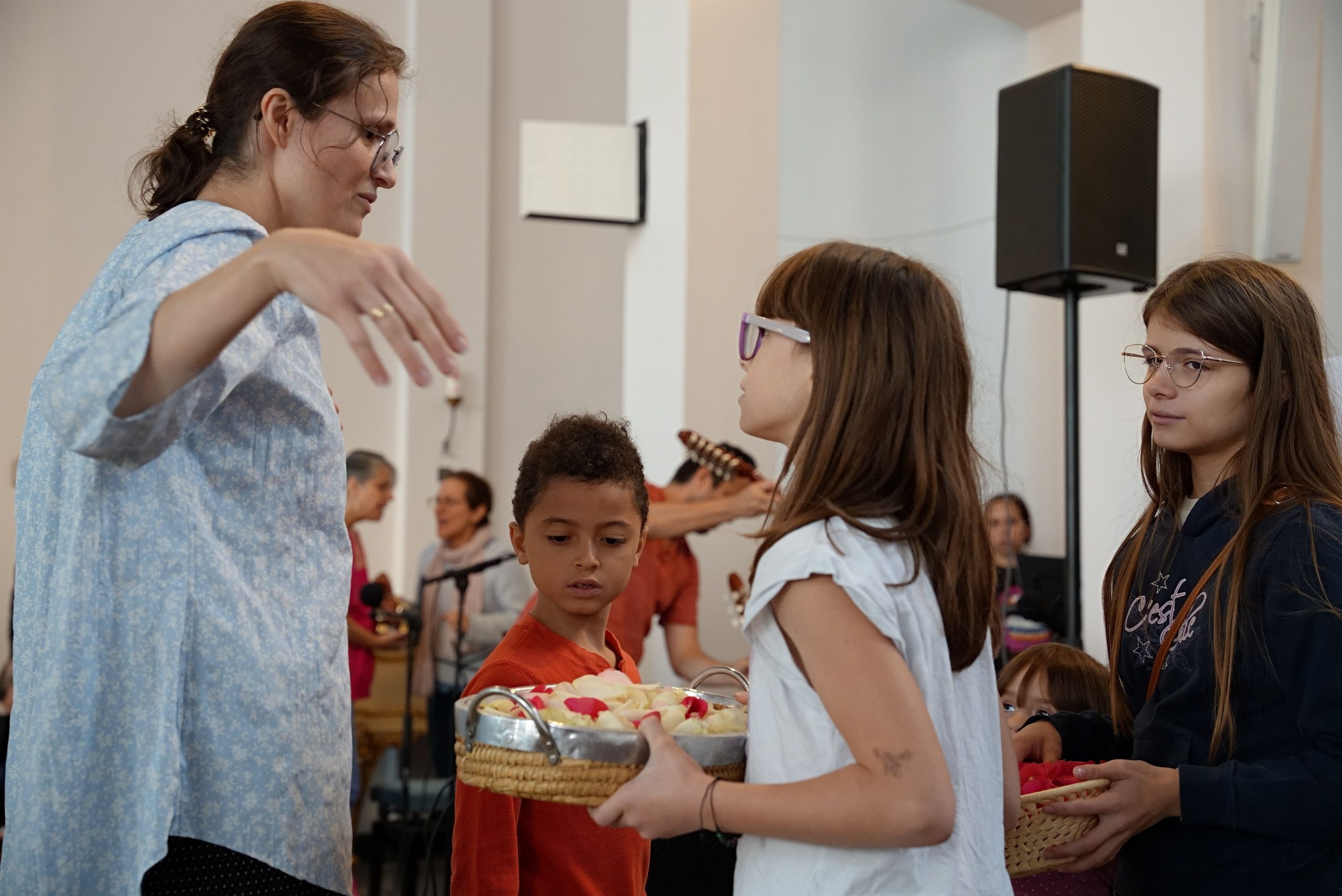 EL segundo día de retiro el Padre Tobias Kessler y nuestro director y encargado de la delegación Nacional, Pfr. Dr. Ferrán Jarabo Carbonell concelebraron temprano una Santa Misa en dos idiomas. Después hubo adoración de corte carismático, y por la tarde una hora Santa al estilo Hakuna. Durante el día la oferta de talleres y conferencias fue extensa: Nuestra soprano Lourdes Martin Ramos vino por segunda vez a Fráncfort para trabajar la técnica vocal infantil e impartir una clase maestra sobre la misa rociera. Nuestra mezzosoprano y percusionista colombiana Mónica Madrid llegó desde Regensburgo a impartir otra clase maestra, esta vez de cantos colombianos con influencia africana. Desde Heilbronn viajó Carmen Viada para escenificar un pasaje bíblico con los niños de nuestro retiro. Ella es cantante y pianista, se formó como directora escénica en la compañía cubana de teatro infantil, La colmena, que fue denominada como embajadora de buena voluntad de la UNICEF. Además, desde Essen llegó el guitarrista ecuatoriano Andrés Salazar, jazzista y arreglista para mostrar cómo escribir partituras y hacer producción musical en el ordenador. Igualmente, de Ecuador, la coreógrafa Carolina Utterman impartió Zumba para niños en base a cantos de adoración. El Dr. Ignacio Olivarec, impartió cátedra sobre la espiritualidad en y a través de la música, y explicó el significado del canto en las diferentes partes de la Misa. Por mi parte, en tanto que etnomusicóloga, promotora de cultura de paz, del canto de sanación y del trabajo artístico interdisciplinario en los campos sociales, ofrecí un taller vivencial referente al canto litúrgico hispano y latinoamericano como herramienta de autoayuda en el duelo de migrante. Nuestro equipo de talleristas contó con la colaboración de diversos instrumentistas: el peruano Samuel Evguin tocó la Quena y flauta de pan, Adaney Cruz, organista mexicano acompañó varios cantos durante la eucaristía y los talleres ;en la batería brillaron los jóvenes Nils Grenzdörffer y Rubén Simó. Tuvimos también como invitado especial a Carlos Hernández, cantante de grandes escenarios y ahora director de los grupos musicales de la comunidad de Múnich. El estuvo vocalizando a los participantes del retiro interesados en desarrollar su voz.